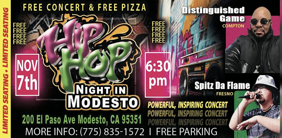 HIP HOP NIGHT in MODESTO Free concert & pizza. If you like Hip Hop you need to go to this event. + Add to Google Calendar + iCal / Outlook export 00 days 00 hours 00 minutes 00 seconds