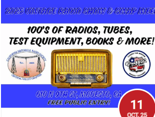 Radio Club Swap Meet California Historical Radio Society – Central Valley Chapter Presents: Radio Swap Meet Saturday, October 11th, 9AM-1PM 610 N 9th St, Modesto, CA 95350 Event Free to the Public View and purchase a large variety of vintage radios Also featuring antique & vintage radios retrofitted with Bluetooth technology For a modest $10 Seller’s fee, vendors can offer vintage radios, parts, tools, test equipment and more to eager collectors For Information Call, Text, or Email Joe Phone: (209) 988-2803 Email: jr_holland@outlook.com Mike (925) 405-2518 Email: lopermike1@gmail.com + Add to Google Calendar + iCal / Outlook export 00 days 00 hours 00 minutes 00 seconds Location Graffiti USA Classic Car Museum Graffiti USA Classic Car Museum Website https://graffitiusamuseum.com/ More Info Read More